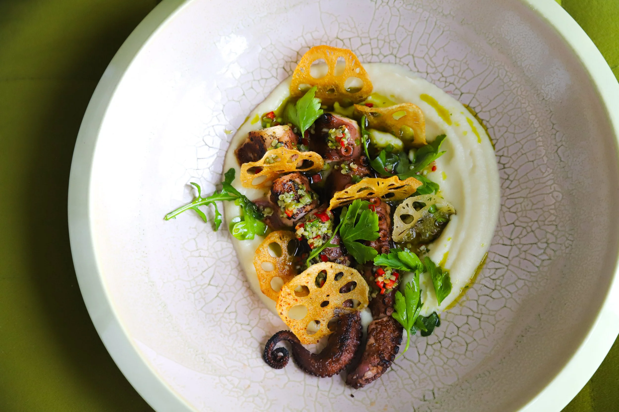 Charred Octopus with Celery root puree, Fresno chili relish & Lotus chips