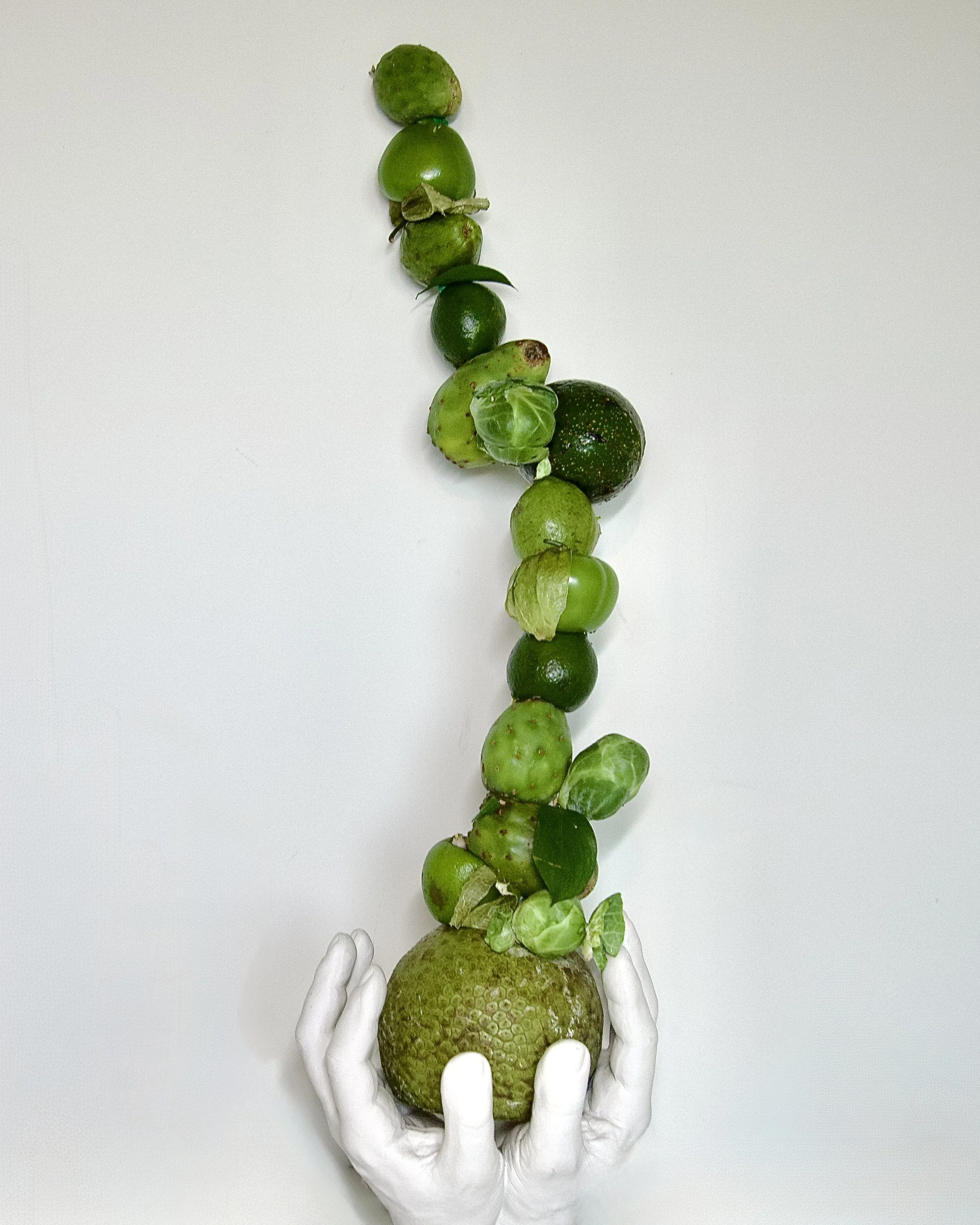 Tomatillos, avocado, tunas, breadfruit, limes, Brussels sprouts. Each stacked by friction. Six studies in green, one axis.